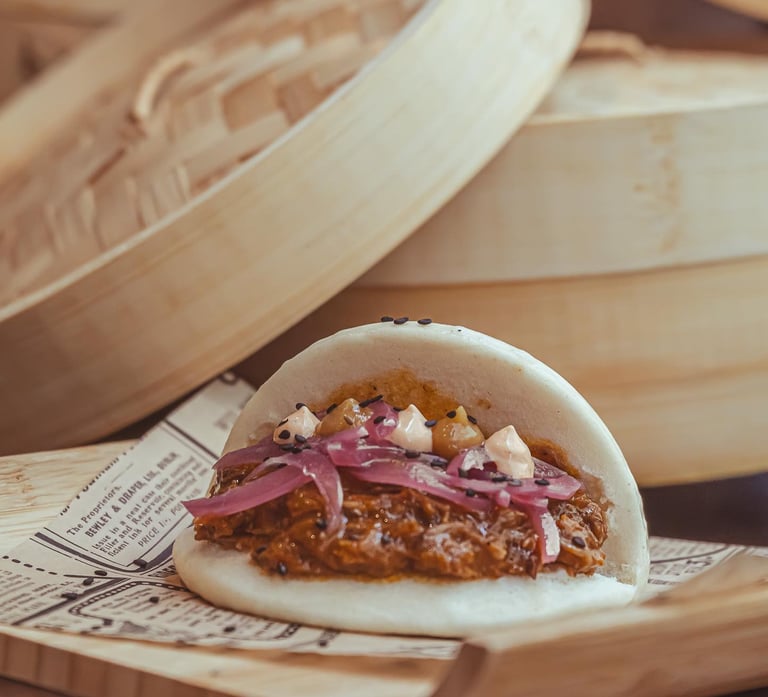 Para quien no conozca que es el pan bao, es un panecillo cocinado al vapor, originario de los países asiáticos. Aquí fusionamos la cocina asiática con la española, trayéndoos está versión con carrilleras caseras por nuestro chef, cebolla encurtida, mayonesa sriracha y compota de manzana.